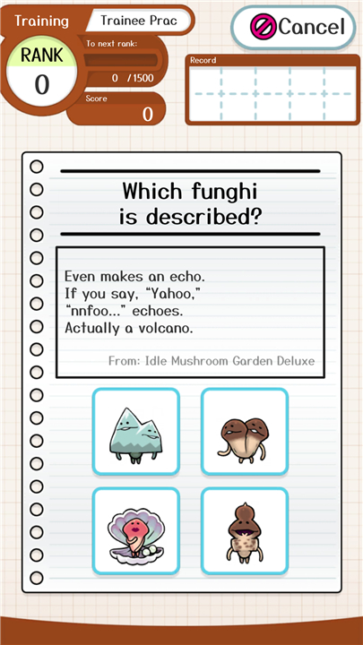 A: Training Mode is a relaxed, practice-focused section of the app where you can answer mushroom-themed questions at your own pace. These questions range from simple facts to more detailed lore, making it a great way to learn while having fun.