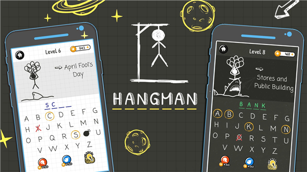 • Interactive hangman animations respond to every letter you choose.