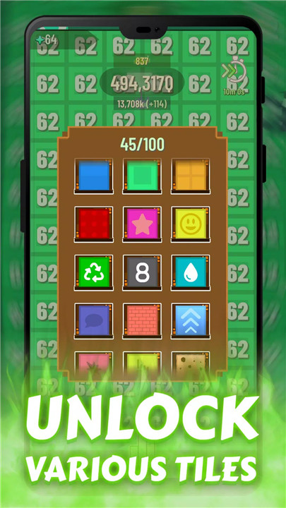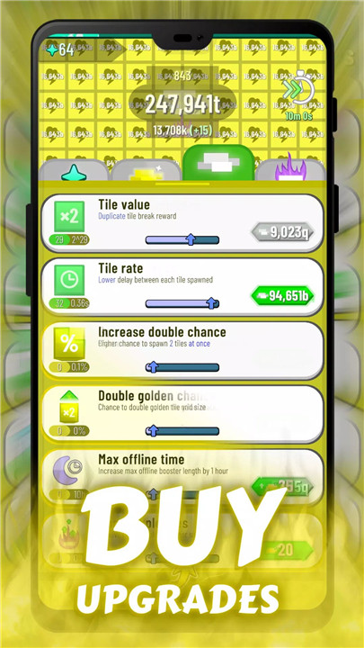 Tiles Idle is a free offline idle clicker. Click on tiles, buy upgrades, and boost your progress with simple actions. Break tiles to earn money and invest in upgrades that amplify your earnings. Choose your game experience between actively clicking, or a more idle playstyle.