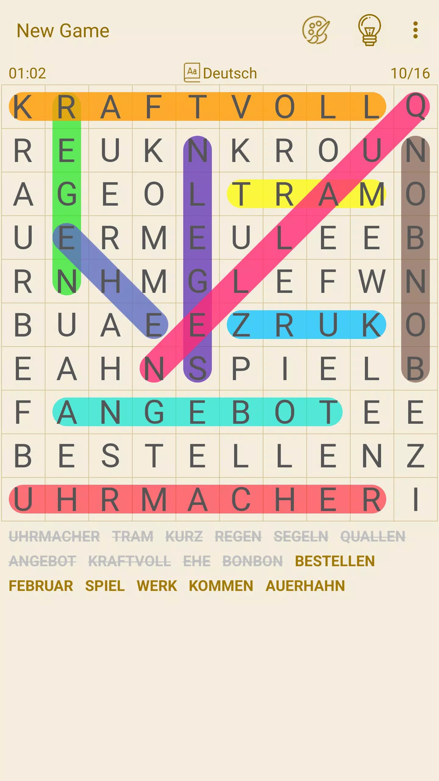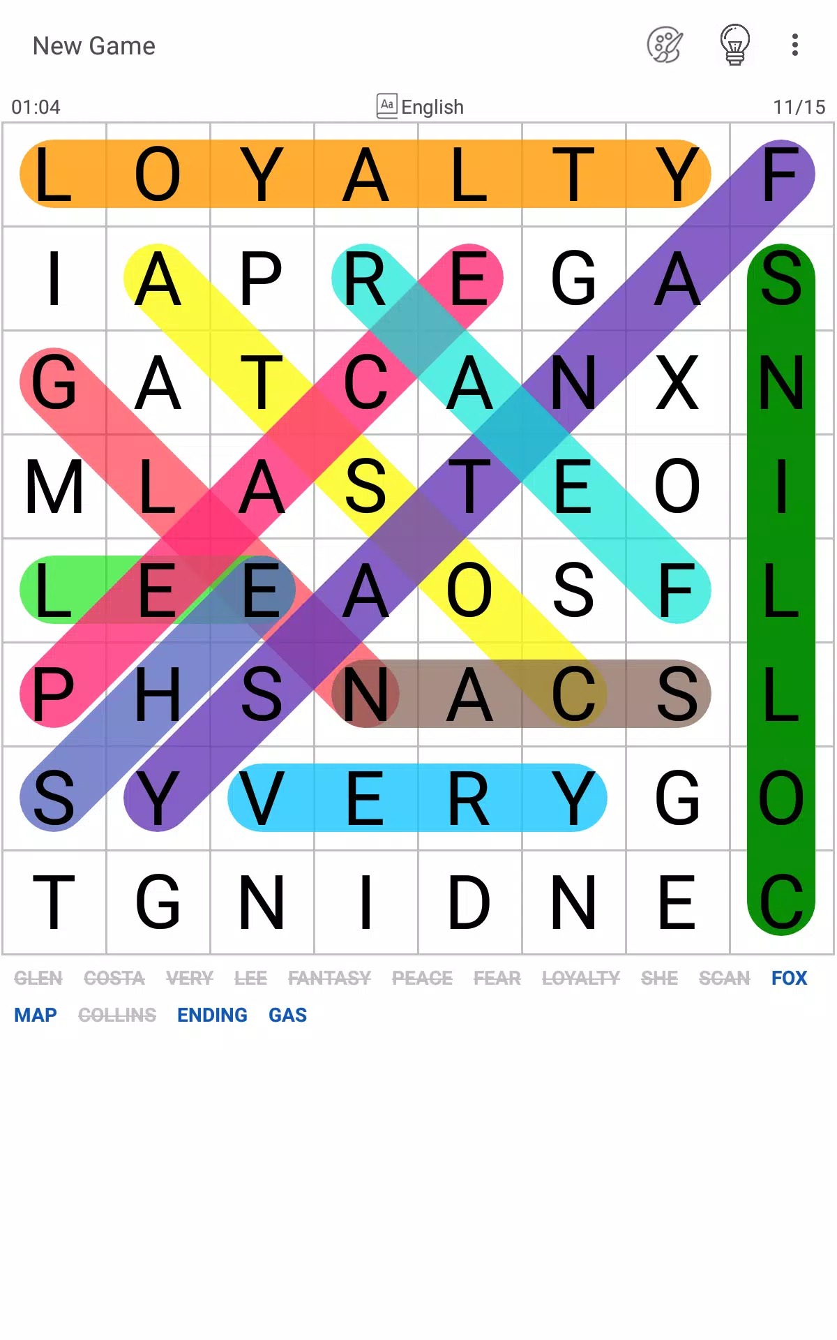 ★ Hints and Assistance: Use hints and assistance options to help you find words hidden within the grid, including highlighting letters, revealing words, and showing hints for the remaining words to be found.