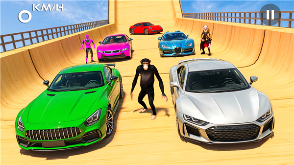 • Choose from an extensive fleet of unique stunt cars, each meticulously crafted with distinct speed, acceleration, and control attributes, allowing you to optimize your performance for various track layouts.