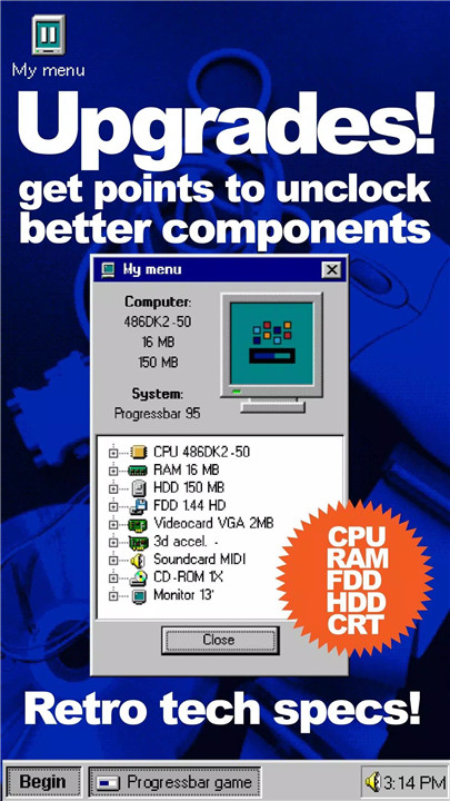 Travel back in time into the world of vintage computing with Progressbar95 - a delightful mobile game that captures the essence of early PCs and operating systems. Get ready for a journey filled with addictive gameplay, retro vibes, and charming surprises!