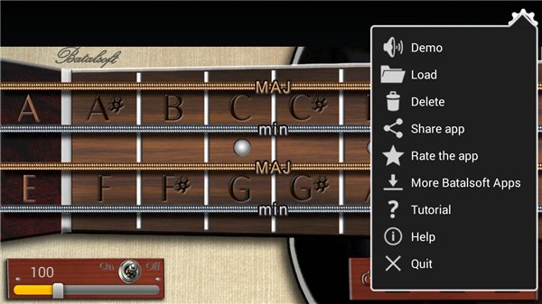 • Chords are activated by tapping the strings or frets on the virtual neck.