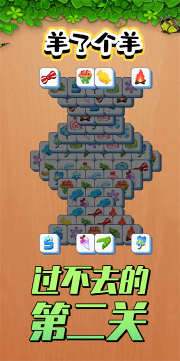准备好迎接极限挑战吗?羊了个羊是一款让人上头的消除游戏,通关率低于0.1%,每一局都是对你思维和反应能力的考验!在这个充满乐趣的游戏中,玩家需要从上方堆叠的方块中选择三个相同的进行消除,目标是清空所有方块才能顺利过关。