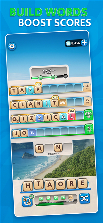 • Store unused letters temporarily in special freecell slots to rearrange your strategy, form longer words, or set yourself up for powerful scoring opportunities.