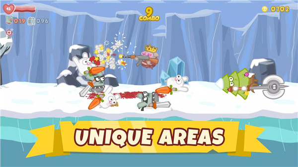 Your road to survival is swarmed by zombie bunnies, rogue bandits, skeleton warriors, and mutant beasts. Every level brings new enemy types and chaotic encounters to test your reflexes and combat skill.