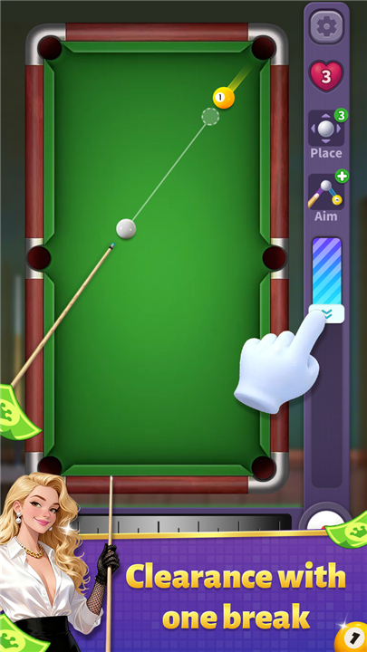 + Flick to Strike: Release your finger with a gentle flick, launching the cue ball with satisfying force. There are no complex button combinations or intricate commands, just pure, tactile action that feels natural and responsive.