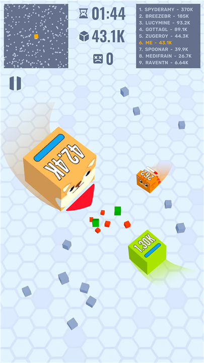 A: Once you appear in the arena, you simply move around to gather the scattered smaller cubes. As you absorb these fragments, your size and mass increase, which in turn boosts your speed and collection radius. Early on, your best bet is to stay nimble and focus on gathering clusters of cubes rather than chasing large opponents.