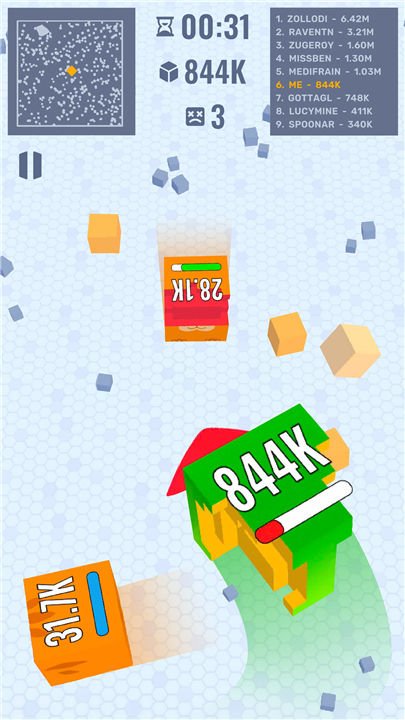 A: If your cube strikes an opponent that is bigger than you, your cube shatters into tiny voxels and you have to respawn as a small cube. This mechanic adds a layer of danger, meaning you must always keep an eye on the leaderboard and avoid the top contenders until you’re strong enough to take them on.