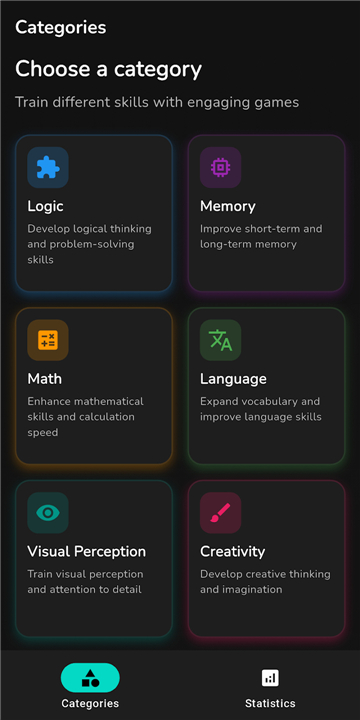 The core of the Brain Buddy experience is built around six distinct cognitive categories, each intended to stimulate different neural networks through specialized mini-games and tasks: