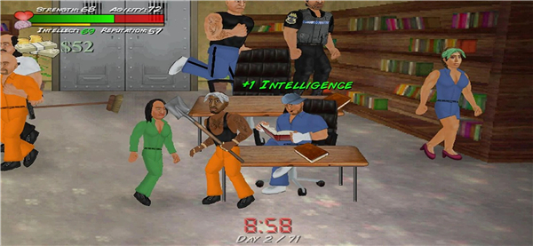 A: You build Strength through weightlifting or hand-to-hand combat, while jogging circuits or shooting hoops boosts your Agility. Reading books or studying in the library increases your Intellect, and Reputation grows whenever you complete tasks, help (or intimidate) other inmates, or win fights. Balancing these activities is key to becoming a well-rounded inmate.