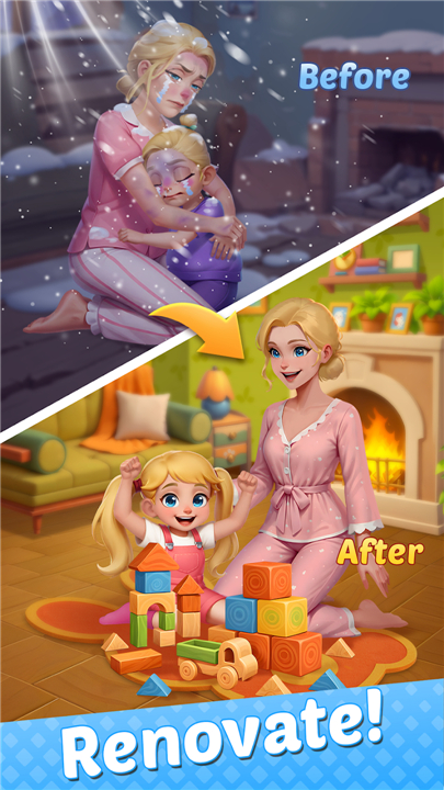 • Spend merge-earned coins to rebuild Julia’s damaged home.