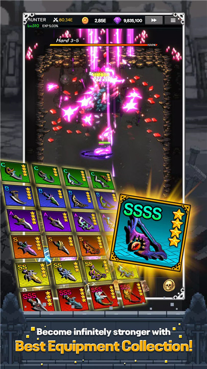 Engage in thrilling, fast-paced hack-and-slash battles against a variety of monsters and bosses. Every encounter brings new challenges, from smaller enemies to massive bosses with unique abilities. Collect loot from fallen enemies, including powerful weapons, gear, and items that can be used to upgrade your hunter’s skills. The action never stops, making every moment in Pixel Hunter Idle both exciting and rewarding.