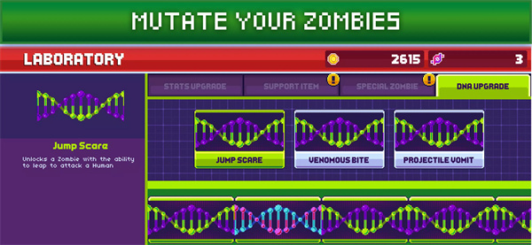 Unlock new zombie types by mixing DNA, from normal walkers to jumping alien parasites. Create your own zombie army and learn their skills to take down humans.