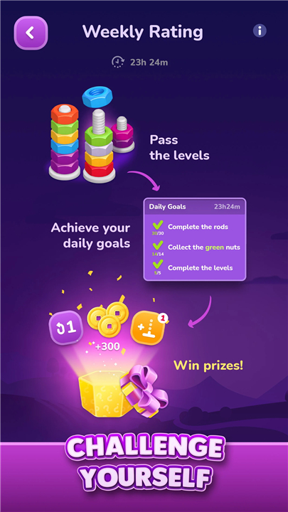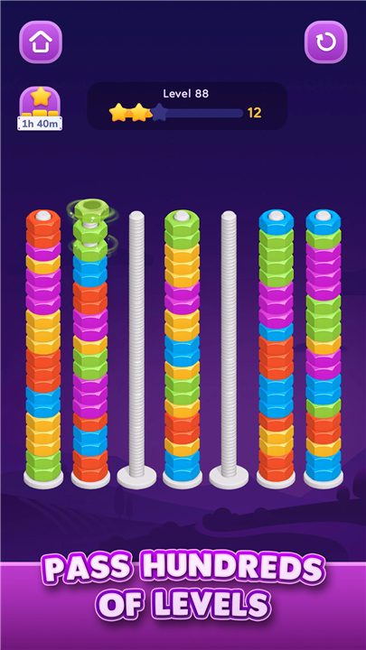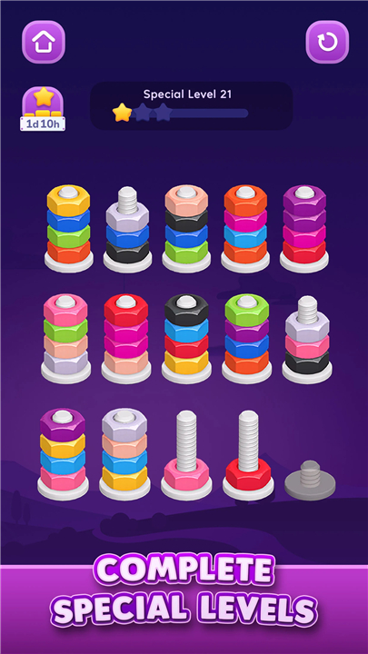 • Your goal is simple yet addictive: sort nuts by color until each bolt holds a perfect match.