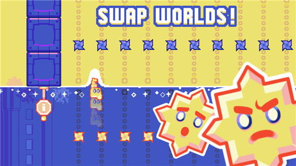• Innovative Swap Mechanic: Jump through the floor to instantly flip into the alternate realm. Both worlds coexist and can be used strategically to reach new areas.