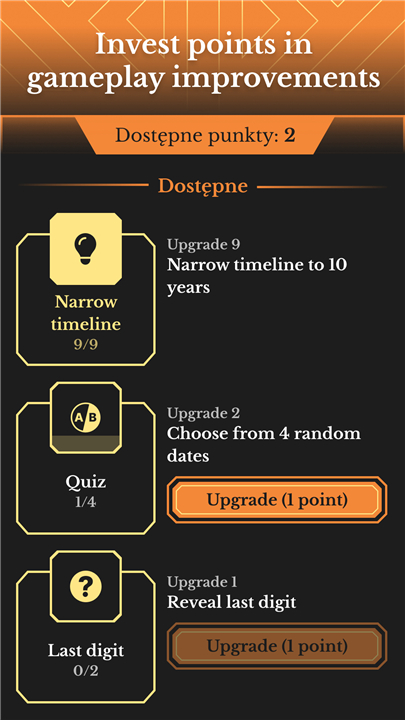 • Multiple hint options including narrowing the timeline, revealing the last digit of the date, or switching to multiple-choice quiz mode.