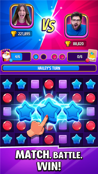 • Charge your unique Booster by matching blue stars, while your opponent gathers their own resources through red circles.