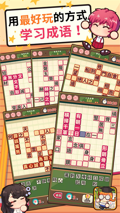 《成语教室》是一款富有趣味的成语学习游戏,旨在通过轻松的互动方式提高玩家的成语能力和记忆力。游戏分为五个难度等级,玩家将在各个关卡中挑战成语填空与联想,既能增长知识,又能锻炼思维。每个关卡提供丰富的提示和道具,帮助玩家轻松克服难题。过关斩将,成为成语高手!