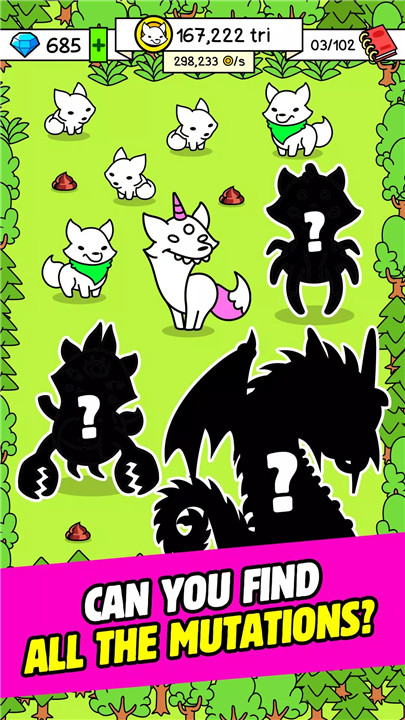 Evolution Galaxy captivates with its doodle-style illustrations, offering a charming and immersive visual experience. In between the merging of animals; it also weaves an engaging story through its vibrant, playful graphics and various levels of mutant creatures. Expect to encounter a wide range of mutants, from cats and dogs to more exotic forms like zombies.