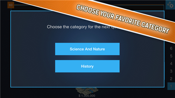 • A unique general knowledge challenge where you begin not at the bottom, but at the very top with a full 1 million prize fund.