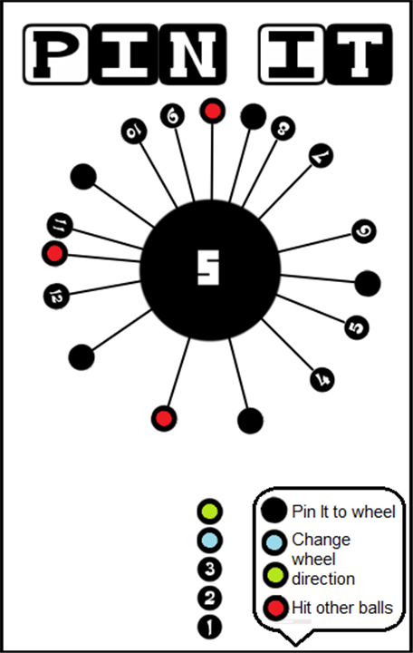 • At the center of the screen spins a large wheel, and your goal is to pin all of your smaller balls to this wheel without causing unwanted collisions.