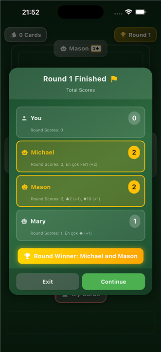 A: You win a round of Fanti by creating a combination of cards that exactly equals 21. If both you and the AI achieve 21, the round is a tie and scores remain even. If neither side reaches 21, the player whose total is closest to 21 without going over claims the win. Accumulate wins across rounds in Classic Mode or celebrate single achievements in Single Round Mode.
