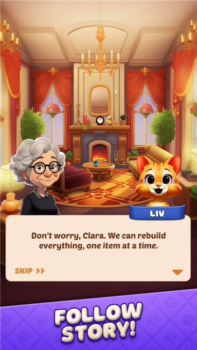 • Immerse yourself in a delightful world where vibrant match-3 challenges intertwine with a heartwarming story of home and town renovation.
