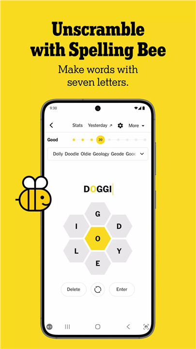 · Spelling Bee: Build as many words as you can using 7 letters. Find the pangram and aim for Genius level.