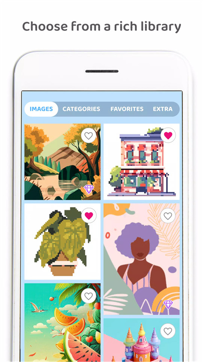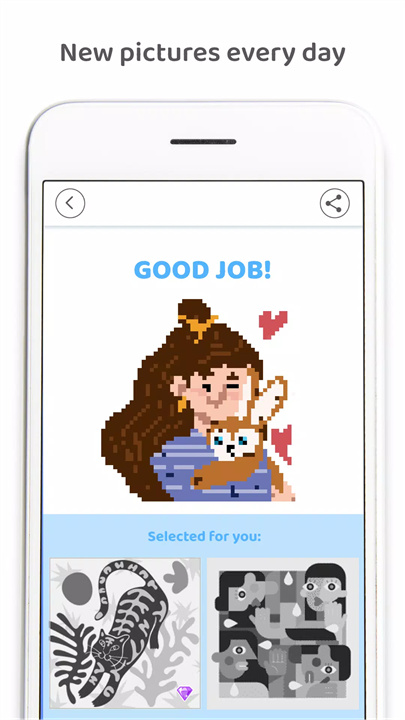 直观的操作界面让大家可以轻松上手,只需选择颜色,逐个像素进行填充。随时离线创作,随心所欲地沉浸在像素的世界中。