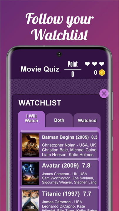 • Create a personal watchlist as you play, helping you track the movies you’ve seen and those still on your list.