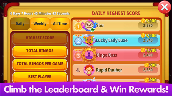+ Race to the top of the leaderboard; the player with the most bingos when time expires claims victory.