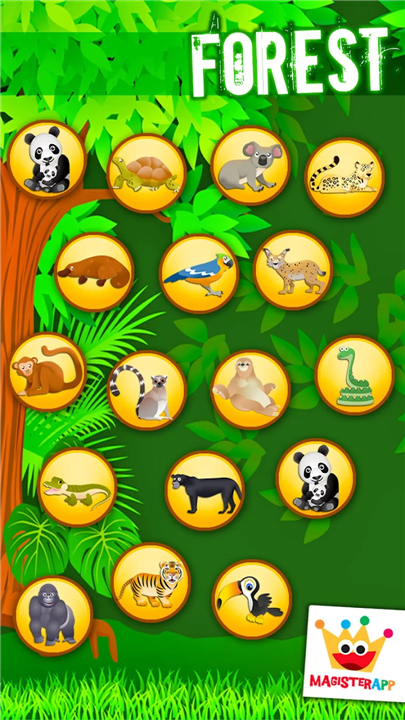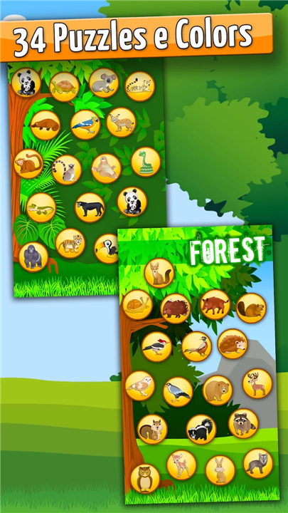 • Step into a playful forest filled with puzzles, colors, and cheerful animals.