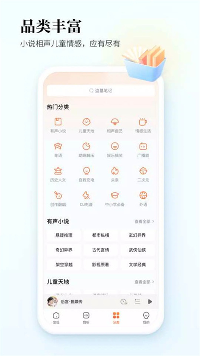 提供经典的小说系列,如《盗墓笔记》、《鬼吹灯》、《斗破苍穹》、《凡人修仙传》、《超级医仙》等,涵盖多种类型,满足各类书迷的听书需求。