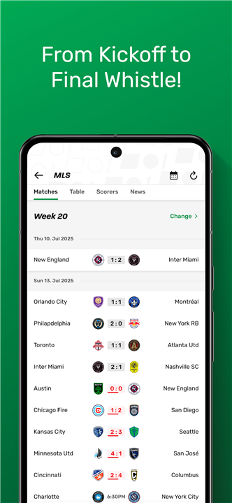 • MLS (Major League Soccer): Get real-time updates for every MLS fixture, including live scores, final results, and match statistics.