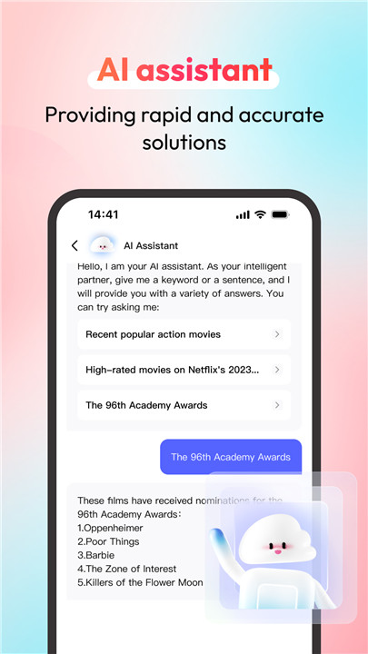 A: The AI Assistant serves as your intelligent companion, ready to quickly respond to your inquiries. Whether you need help finding film and television resources or require assistance with daily tasks, the AI Assistant provides tailored solutions to improve your information search efficiency.