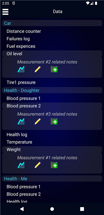 Diary for results, measurements, expenses, earnings, and almost any other data Download the latest version of Measurements diary Lt. 1.6.89 to enjoy new features and updates immediately!