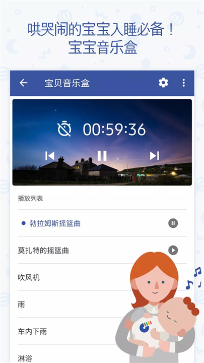 摇篮曲:哄睡时播放摇篮曲,安抚宝宝快速入睡。