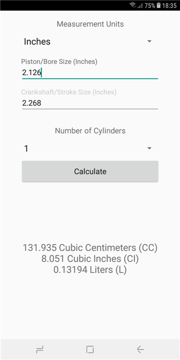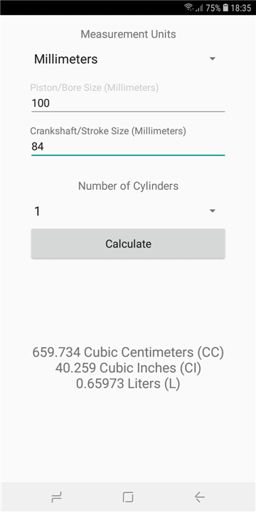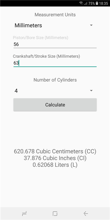 Calculates the displacement for an internal combustion engine (CC, CI, L) Download the latest version of Engine CC Calculator to enjoy new features and updates immediately!