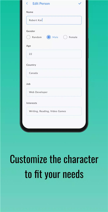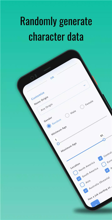 Customizable Settings: Personalize the character generation process with customizable settings. Adjust parameters such as age range, country preferences, and job categories to generate characters that align with your story's setting and themes. Whether you're creating characters for a specific time period or cultural background, the app allows you to tailor character profiles to your needs.
