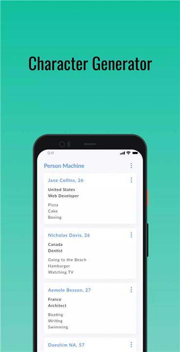 Unleash Your Imagination: The Character Generator empowers you to create fully fleshed characters with just a few taps. Randomly generate names, genders, ages, countries, jobs, and interests to inspire your storytelling journey. Whether you're writing a novel, screenplay, or crafting a new tabletop RPG character, this app has everything you need to bring your characters to life.