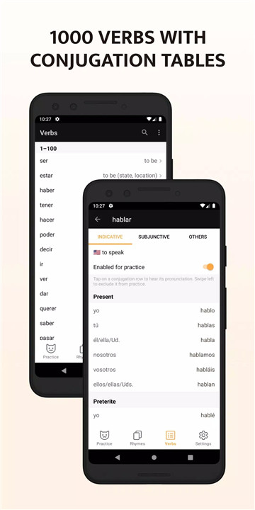 - Audio Pronunciation: Listen to pronunciations for answers, infinitives, and conjugation tables to improve your speaking skills.