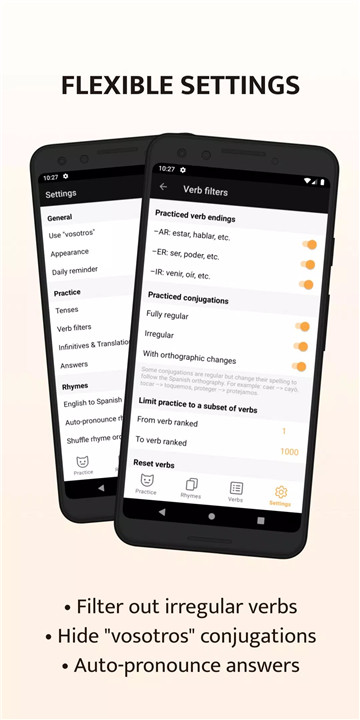 - Flexible Practice Options: Personalize your practice sessions by selecting verbs based on their irregularity, endings, or popularity.