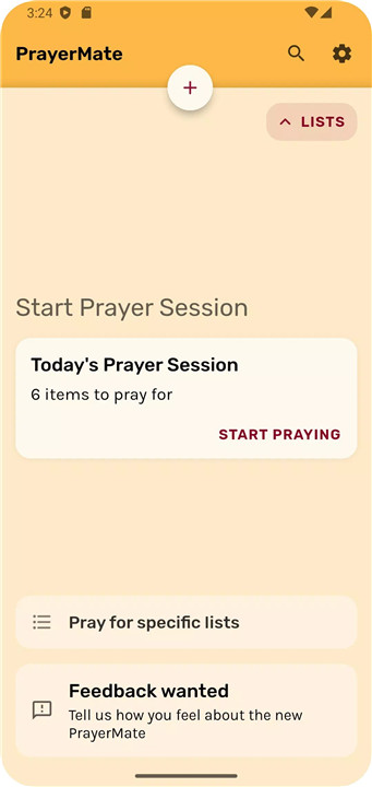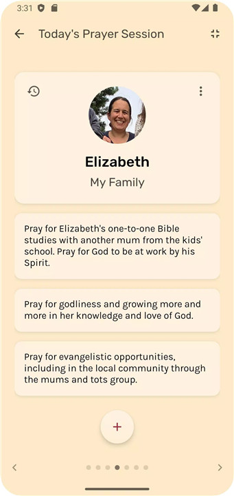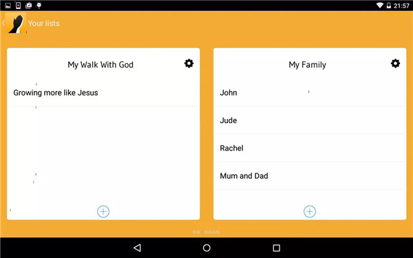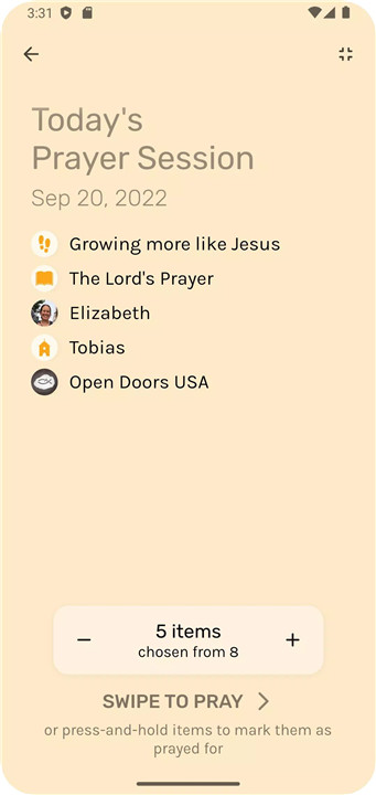 PrayerMate uses an easy swipeable card format to present prayer topics from your personal categories. Each day, it selects one item from each category—like "My family" or "Church group"—so you can pray through a fresh list without feeling overwhelmed.
