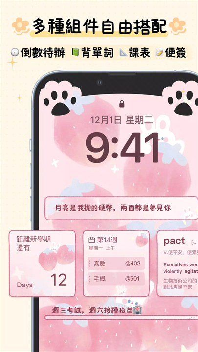 布丁锁屏为您提供多种小组件,包括待办事项、倒计时、便签、天气、日历等,您可以自由组合、调整位置,打造符合个人需求的锁屏界面。每个小组件都可以根据您实际需求调整,让锁屏不仅美观,还能提高生活效率。