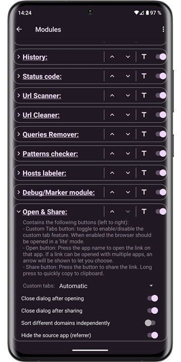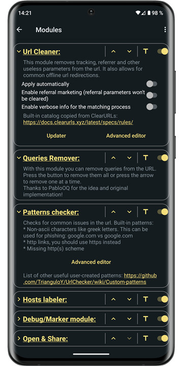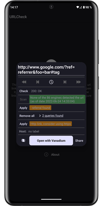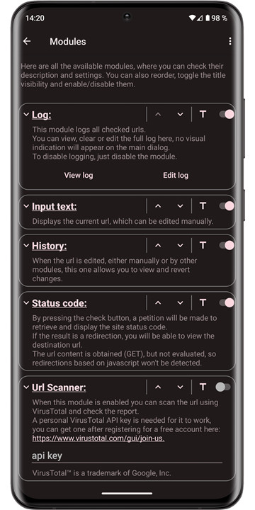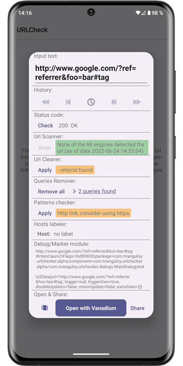 URLCheck, created by TrianguloY for personal use, is an open-source tool (licensed under CC BY 4.0) that is completely free, ad-free, and tracker-free. It is lightweight and requires minimal permissions—only internet access for module checks, which are conducted solely at the user's request. The source code is available on GitHub for those interested in suggesting changes, making modifications, or proposing translations: https://github.com/TrianguloY/UrlChecker.