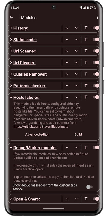 This module categorizes hosts, which can be set up manually or by using a remote hosts-like file. It serves to alert users about potentially harmful or noteworthy sites. The default configuration includes StevenBlack's hosts list, which covers adware/malware, fake news, gambling, and adult content, sourced from https://github.com/StevenBlack/hosts.