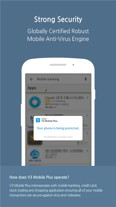 Security Solution for Mobile Financial services and Shopping Transactions Download the latest version of V3 Mobile Plus 2.5.30.10 to enjoy new features and updates immediately!