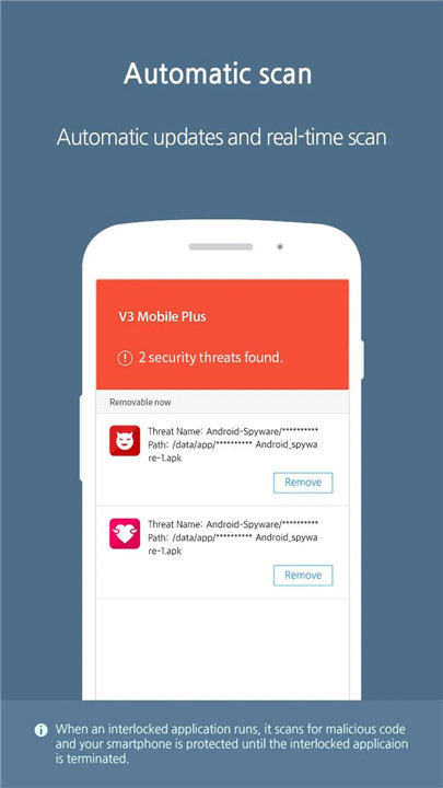 A key highlight of V3 Mobile Plus is AhnLab’s state-of-the-art mobile anti-virus engine. This robust tool is crafted to shield your smartphone from a variety of threats, such as viruses, worms, Trojan horses, and different forms of malware. While you engage with applications linked to V3 Mobile Plus, the anti-virus engine will automatically refresh to provide you with the most up-to-date protection. Additionally, the Real-Time Scan feature continuously monitors your device for any potential malware risks; should any harmful files be identified, you can swiftly remove them, keeping your device secure from danger.