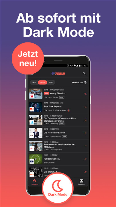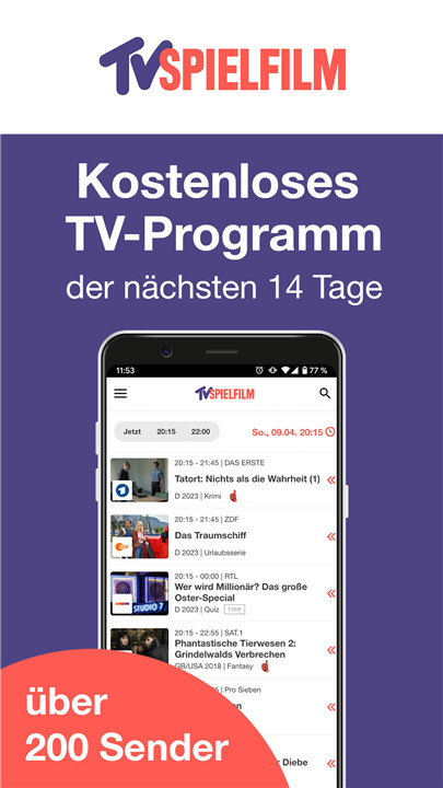 Free TV program: 200 channels, media libraries, streaming. Your TV app! Download the latest version of TV SPIELFILM - TV-Programm to enjoy new features and updates immediately!